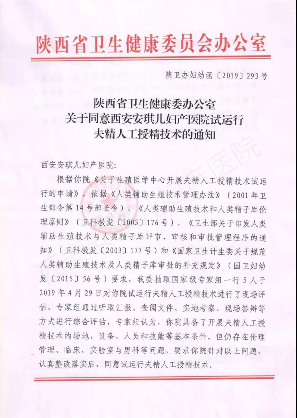 2019年4月29日,由省衛(wèi)健委組織國(guó)家級(jí)專(zhuān)家?guī)?位專(zhuān)家,分成倫理管理與男科組、臨床組、實(shí)驗(yàn)室組,對(duì)西安安琪兒婦產(chǎn)醫(yī)院生殖醫(yī)學(xué)中心申請(qǐng)開(kāi)展 “夫精人工授精(AIH)技術(shù)”進(jìn)行試運(yùn)行評(píng)審,專(zhuān)家組通過(guò)聽(tīng)取工作匯報(bào)、現(xiàn)場(chǎng)檢查、文件查閱、會(huì)后討論,從場(chǎng)地、設(shè)備、人員、技術(shù)、管理等五方面進(jìn)行評(píng)審,最終,經(jīng)專(zhuān)家組合議,一致認(rèn)為西安安琪兒婦產(chǎn)醫(yī)院生殖醫(yī)學(xué)中心在場(chǎng)地、設(shè)備、人員、技術(shù)和管理等方面基本具備了開(kāi)展夫精人工授精的條件,同意試運(yùn)行夫精人工授精技術(shù)。