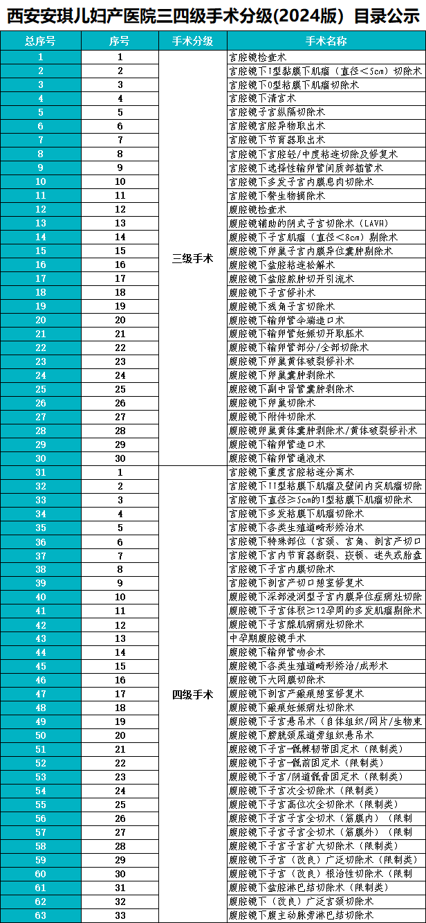 西安安琪兒婦產(chǎn)醫(yī)院三四級手術(shù)分級(2024版)目錄公示